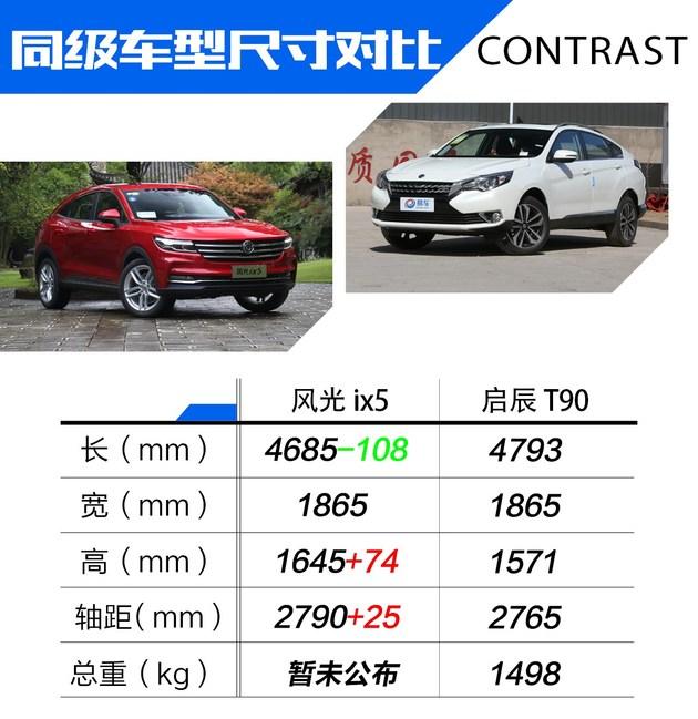 与市场上的另一款轿跑SUV 启辰T90相比,风光ix5在车身长度方面要短于T90,但是在轴距方面,ix5更具优势。