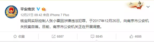 2017年12月26日,钱宝网实际控制人张小雷因涉嫌违法犯罪,向南京市公安机关投案自首。2018年1月21日,央视报道称,经警方初步调查,钱宝网以高额收益为诱饵,持续“借新还旧”向社会公众大量非法吸收资金,截至案发,未兑付集资参与人的本金数额达300亿元。