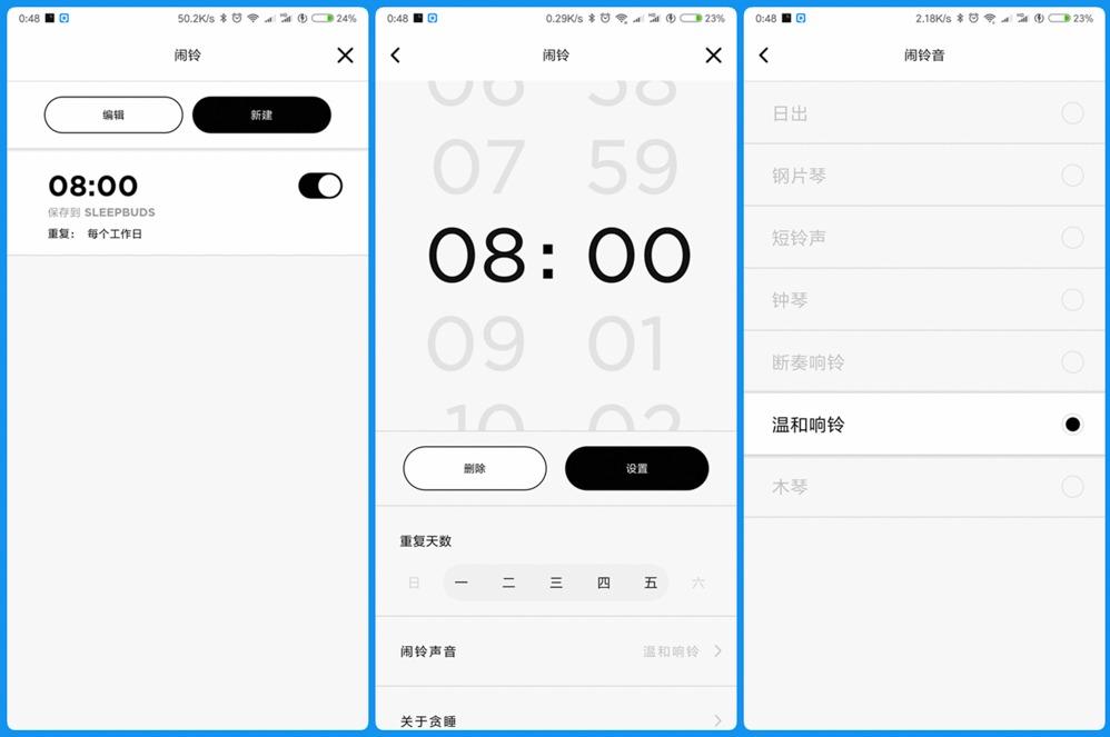 4.Bose遮噪睡眠耳塞还可以设置多个闹钟(包括时间、重复以及闹钟音乐),闹钟还不会扰人。