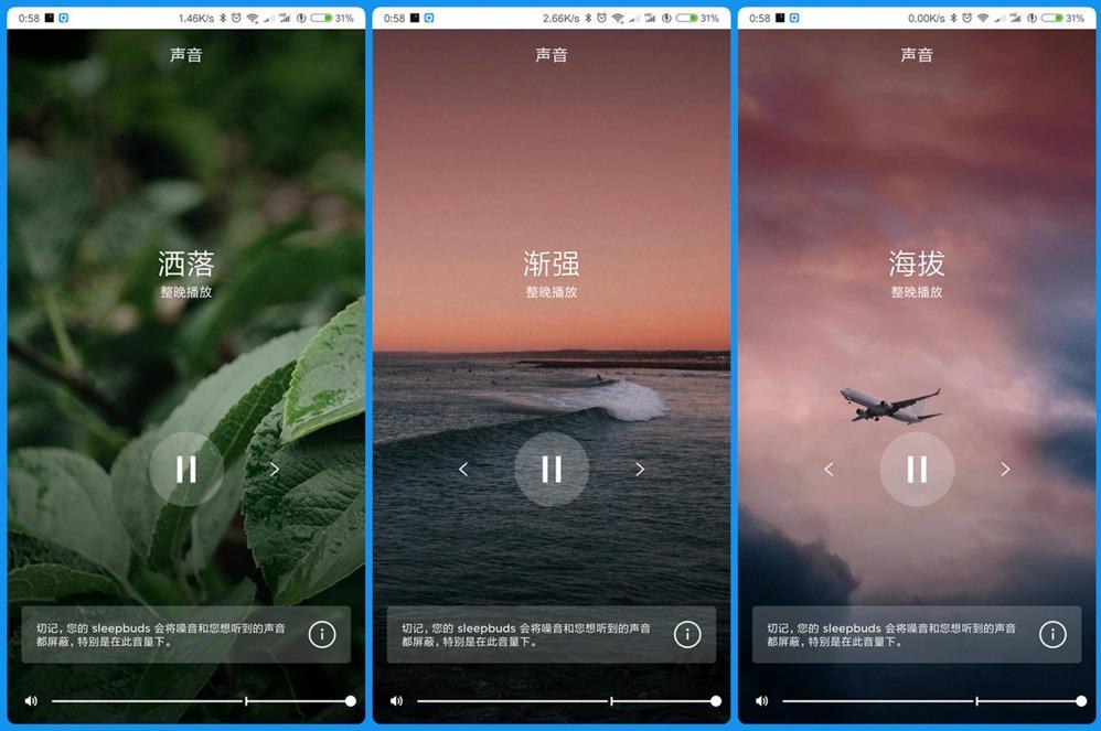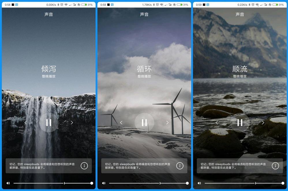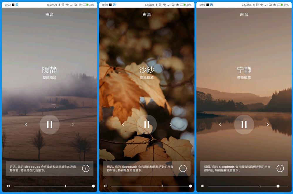 Bose遮噪睡眠耳塞提供了10种声效,用以模拟大自然中最纯粹自然的声音海浪、瀑布、雨声、溪流、风声和乡村之夜,让你置身多个环境中缓缓入眠,我尽量通过语言来描述。
