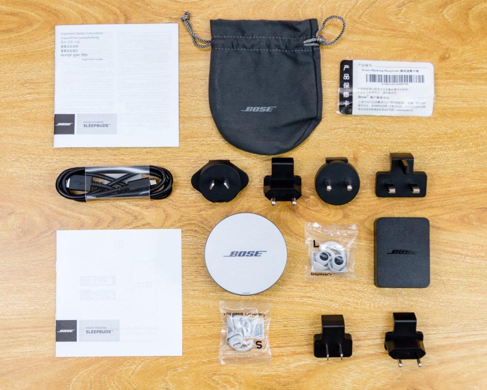 ◇【全家福】:下方就是产品的全家福了,从下图众多的配件可以看出Bose遮噪睡眠耳塞除了耳机、充电保护盒外,标配了数据线、可更换鲨鱼鳍耳塞、多转接口电源插头、收纳袋等。