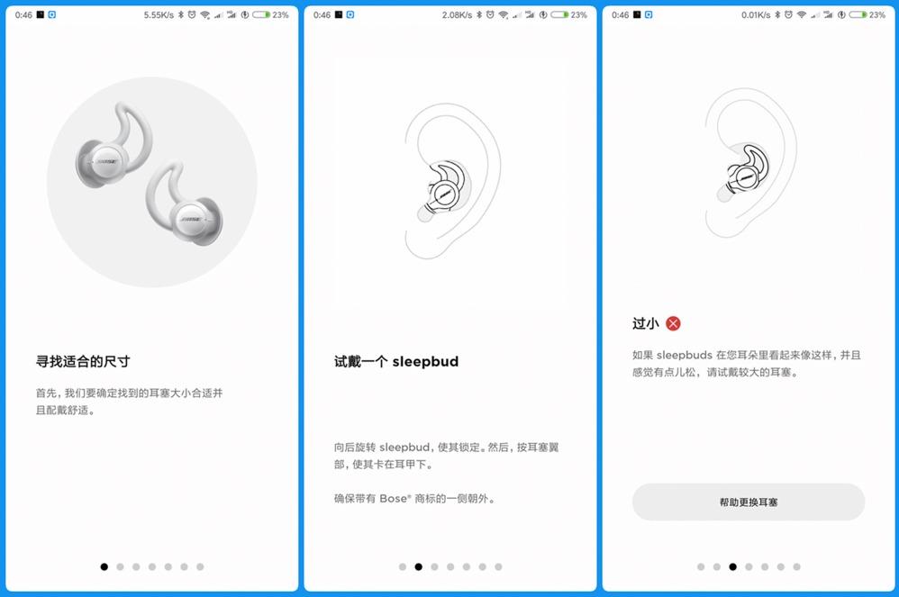◇【使用的介绍】:完成设备配对,Bose Sleep这个APP会通过Gif加文本说明的方式对用户耳塞的选取,佩戴进行逐步的教学,还是相当的细心。