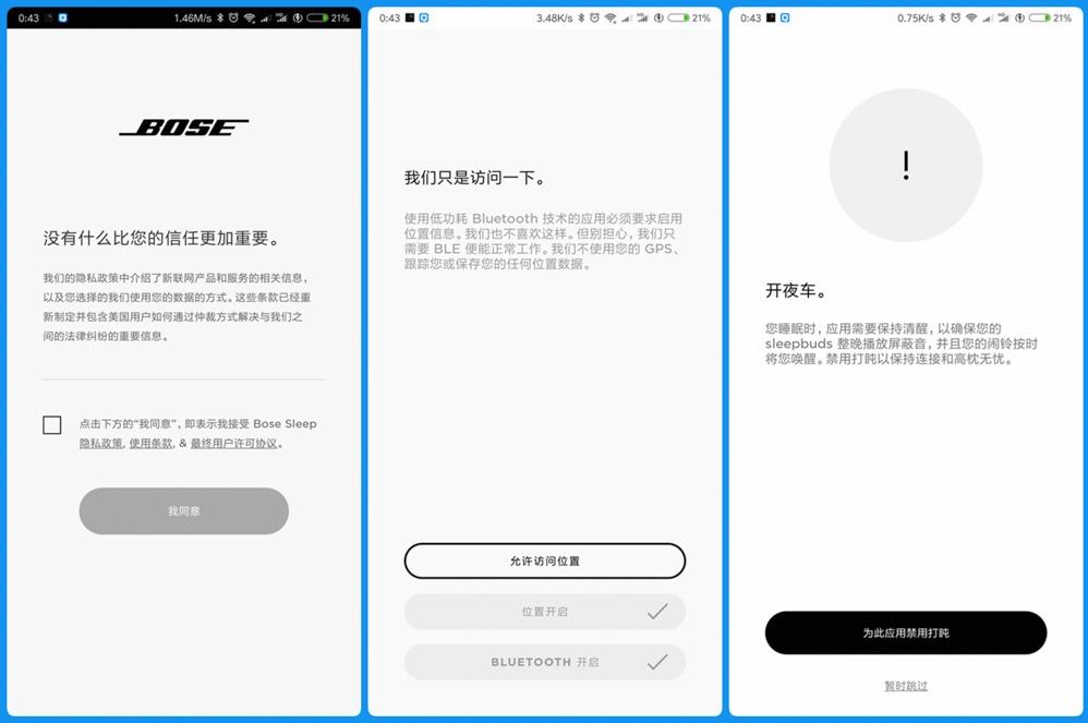 ◇【APP的安装】:Bose遮噪睡眠耳塞的功能主要围绕手机APP展开,首先需要为手机*载下**安装Bose Sleep这个应用。应用会要求账户注册、调用定位技术以及后台运行等权限。