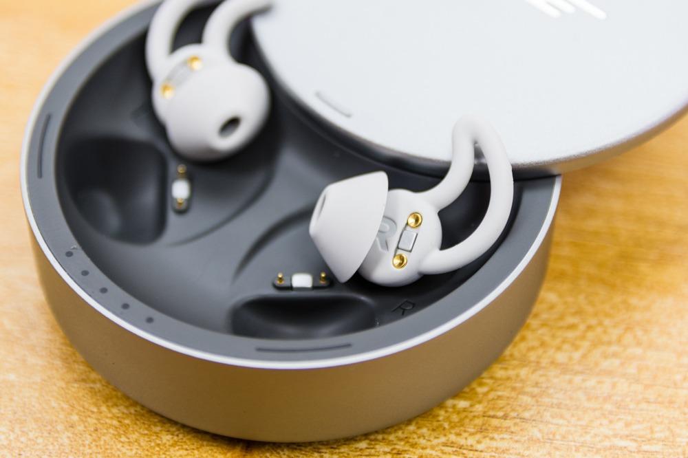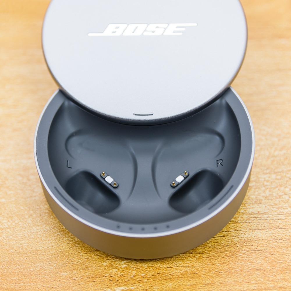 将Bose遮噪睡眠耳塞翻转,即可看到对应的充电金属触点,其左侧的硅胶耳塞上也印有L、R的左右标识。同时在这个视角下还可以看到耳塞对应的收纳盒边缘各有一个弧形的LED开孔,当Bose遮噪睡眠耳塞放置在收纳盒中充电时,指示灯会亮起变成白色呼吸灯显示充电中,正中的五个点状指示灯则用以显示当前收纳充电盒的电量,这与之前我测评的BOSE SoundSport Free,有着异曲同工之妙。