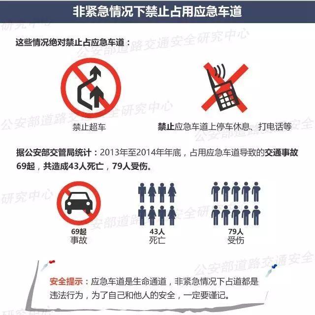 交警提示,高速公路应急车道是专门供工程救险、消防救援、医疗救护和民警执行紧急公务使用的应急通道,被视为救援的“生命通道”。根据交通法规,非紧急情况下违法占用应急车道的要被处以200元罚款、记6分的处罚;对于拒不听从劝阻驶离的,依法拖离,追究妨碍执行公务的责任。