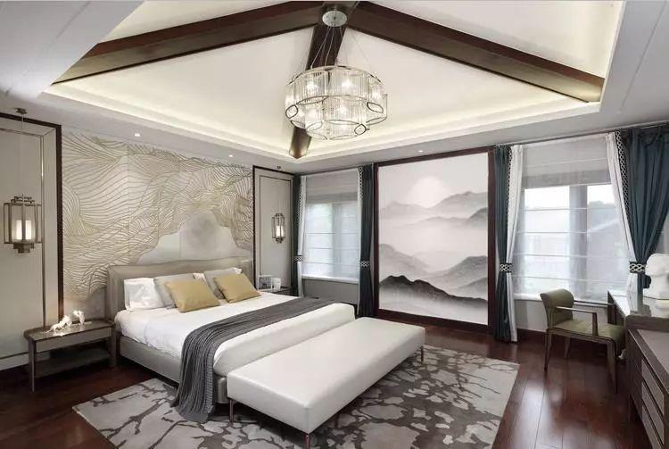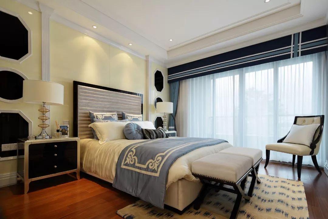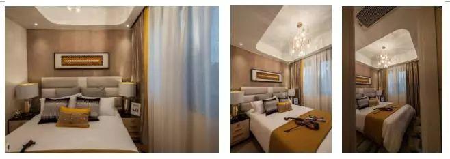 主人房最大的亮点是衣柜门即是电视墙,使衣柜完整如一的同时留出大床的空间。主人房同样采用软包床头,暖色调墙面,圆形倒角天花布局,使整个房间布局统一协调。