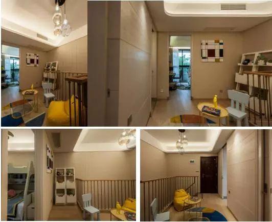 儿童房是最为不确定的功能性房间,高低床的使用让这种不确定性彻底被规避。倒圆角天花和柔和的局部灯带,配以风扇天花灯,让整个空间充满趣味感,柔美而童真。圆形的地毯,童趣的壁画,素色的窗帘,使儿童房活泼热闹的同时不失干净整洁。