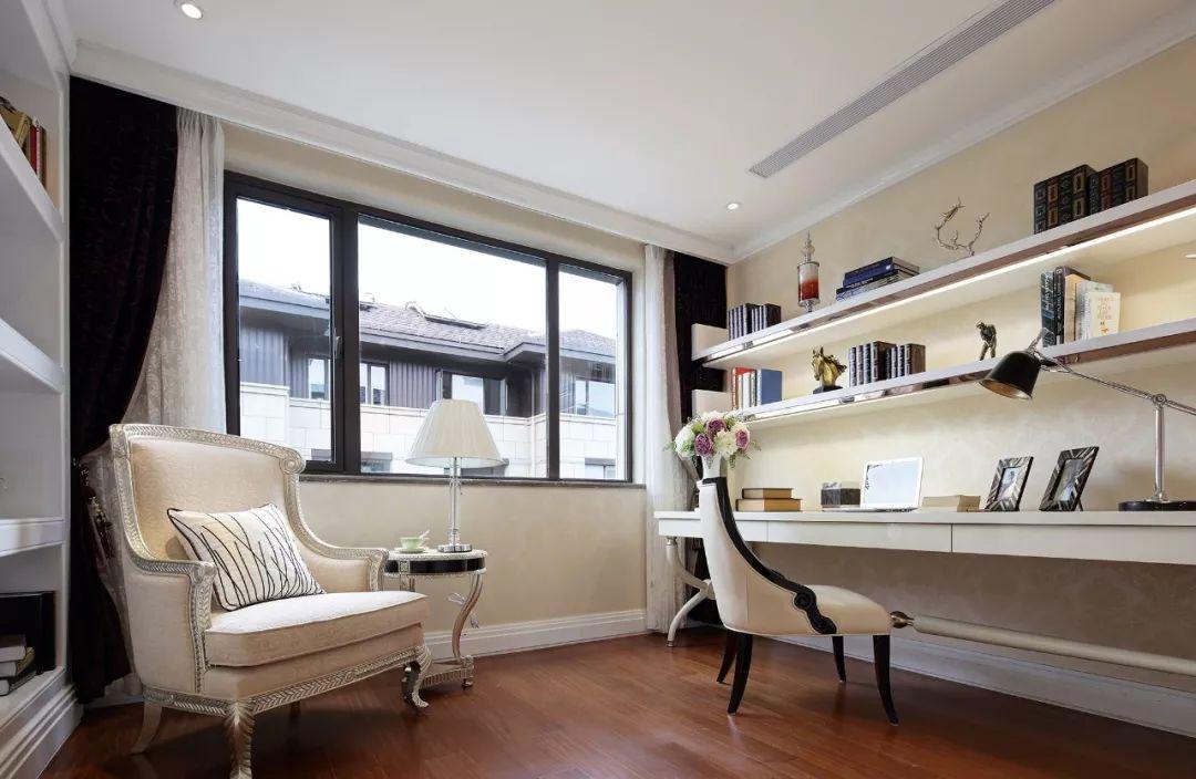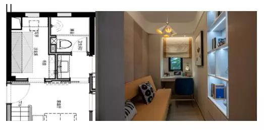 沙发床使原本狭长的书房空间变得灵活多变,白天可以休息,晚上则可做卧室使用。书柜结合墙面铺满一侧,满足主人的藏书需求。白色系的书架配以明亮的小射灯,写字台靠近外窗,这些都使整个书房空间的亮度得到满足。