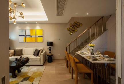 玄关空间受到设计师的格外重视,因为这里是家的第一印象、主人待客的第一门户,更是由外而内的心理过渡,能直接带来归属感的风水宝地。设计师在入户处设计了鞋柜,功能上能方便主人换鞋、挂衣、放钥匙雨伞等,空间上则围和出一个温馨的通道。楼梯下方的空间则华丽变身为海量储存空间,成为收纳系统重要的组成部分。楼梯造型和储物柜门通过暗门的方式融为一体。客厅主色调为暖白色,木饰面墙面、墙布及素色布艺窗帘遥相呼应,营造出简洁温馨的空间效果。天花采用倒圆角造型设计,配合独特的金色喇叭灯饰,顿时画龙点睛般点亮了整个空间环境。地面采用天然木纹地板,配合几何花纹的暖色地毯,和谐而统一。家具主要以浅色调为主,安静而美好。明黄色抽象派墙面装饰画让整个空间氛围跳跃起来,使客厅空间温馨不乏活跃,安静却又灵动。