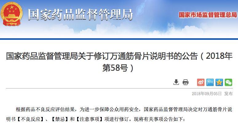 9月5日,国家药品监督管理局发布公告,决定对万通筋骨片说明书【不良反应】【禁忌】和【注意事项】项进行修订。禁忌指出婴幼儿禁用,注意事项也指明,该药不宜长期使用。①