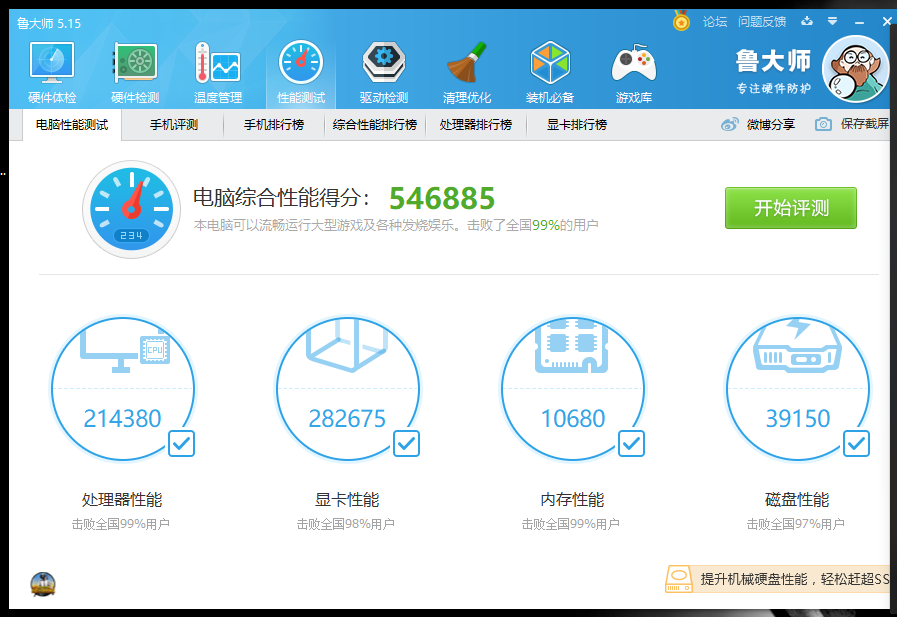 在没超频的情况下鲁大师跑分54.6万多分,如果超频后,跑分65万多,可惜没留65万的截图