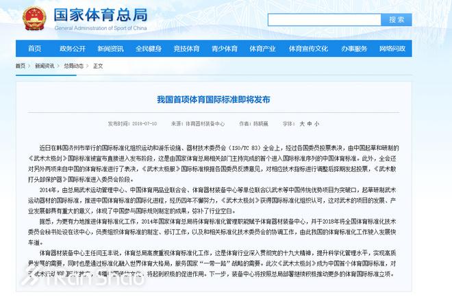 我国首项体育国际标准即将发布,世界反兴奋剂机构科学部主任访华 | 近日,在韩国济州市举行的国际标准化组织运动和游乐设施、器材技术委员会(ISO/TC 83)全会上,经过各国委员投票表决,由中国起草和研制的《武术太极剑》国际标准被宣布直接进入发布阶段,这是由国家体育总局相关部门主持完成的首个进入国际标准序列的中国体育标准。