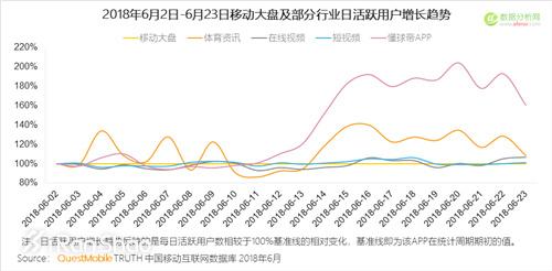 另一个来自QuestMobile发布的《世界杯小组赛数据洞察报告》显示,移动互联网整体流量不受世界杯影响,但体育资讯涨势凸显,最高增幅达39%,DAU增长超过200万。其中垂直类代表APP懂球帝增幅超过70%。日均DAU超过2亿的细分行业均能看到小幅增长,其中在线视频行业DAU增长为2000万+。