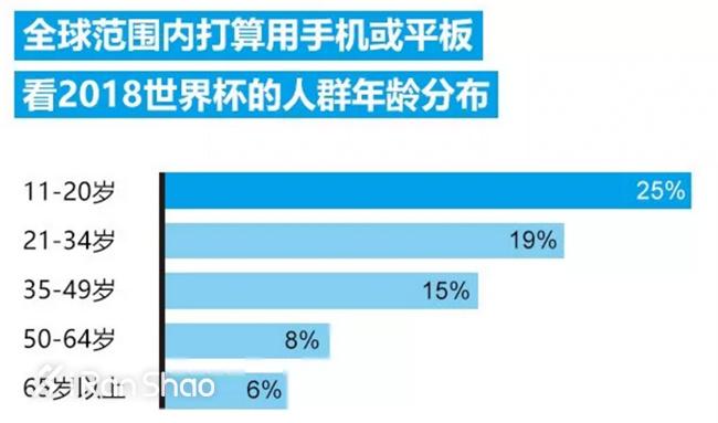 同时,全球范围内11-20岁的青少年中,25%选择在手机或平板电脑上观看球赛。在中国,约35%的受访者选择在移动端看球。