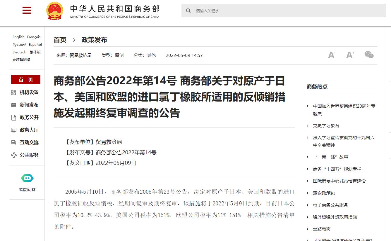 商务部关于对原产于日本、美国和欧盟的进口氯丁橡胶所适用的反倾销措施发起期终复审调查的公告商务部公告2022年第14号