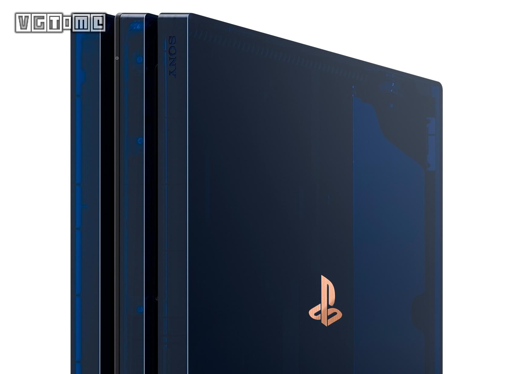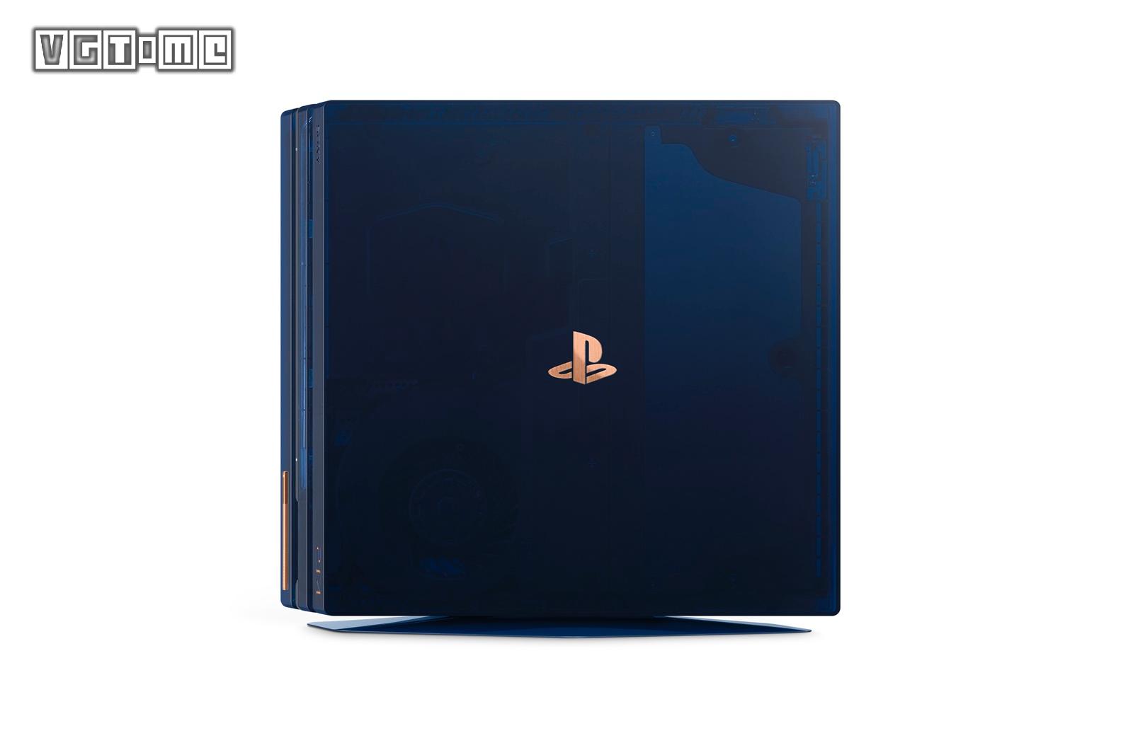 该主机内含 2TB 硬盘,采用深蓝色半透明设计,当启动电源时,主机内部高亮度的蓝灯将会亮起,用户可以欣赏到 PS4 Pro 主机内部的精密构造。顶部表面 PS 标志,以及主机正面的 PS4 字样均采用哑光纹理铜色。