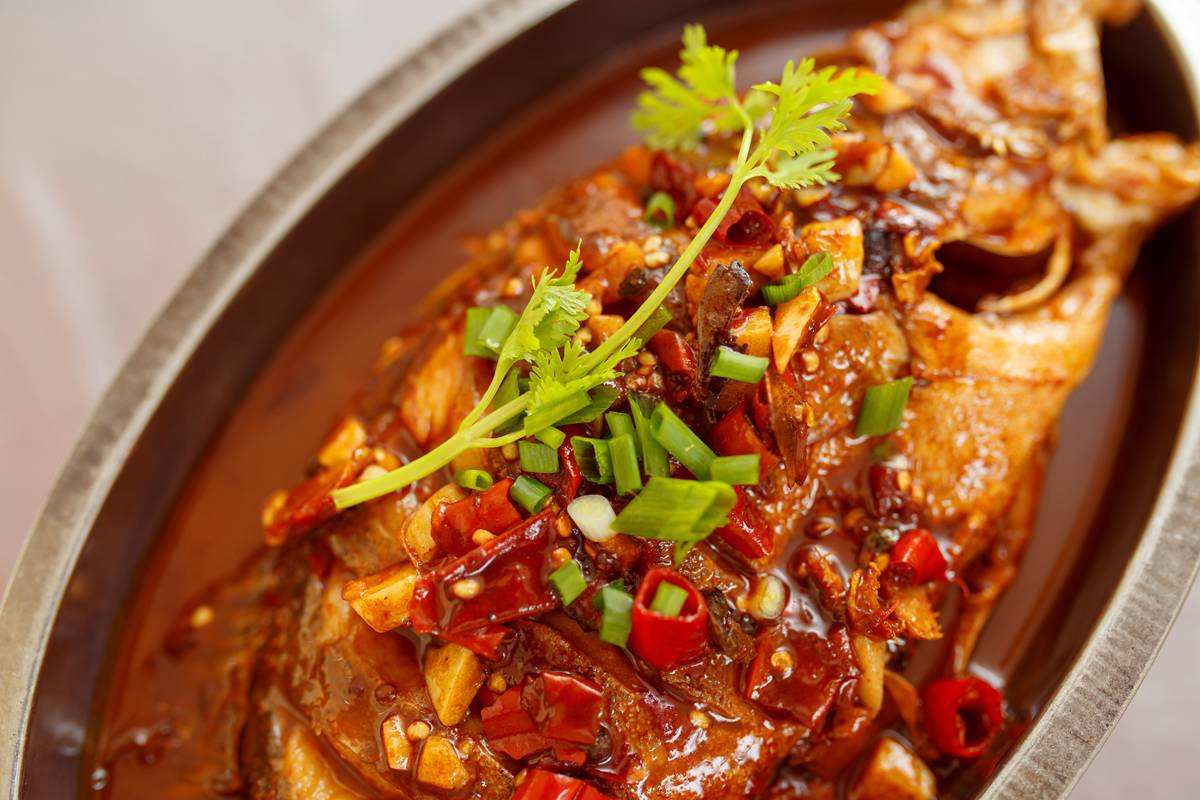 火辣辣的红剁椒,覆盖着白嫩嫩的鱼头肉,冒着热腾腾清香四溢的香气。湘菜香辣的诱 惑,在"剁椒鱼头"上得到了完美体现。蒸制的方法让鱼头的鲜香被尽量保留在肉质之内,剁椒的味道又恰到好处地渗入到鱼肉当中,鱼头糯软,肥而不腻,咸鲜微辣。