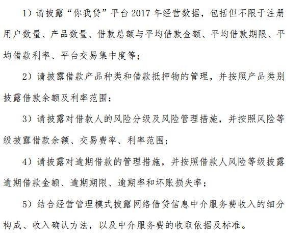 首先,股转系统要求嘉银金科补充披露报告期内“你我贷”平台 2017 年经营数据。根据嘉银金科2017年年报,嘉银金科仅披露了“你我贷”平台全年创收总金额,对于该项业务具体的经营数据或财务数据只字不提。