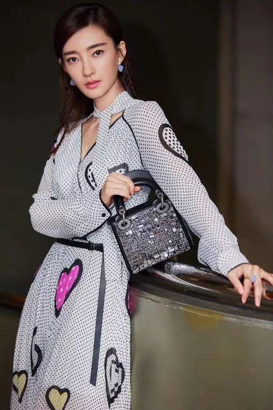 王丽坤身穿Dior白色波点深V领带爱心印花裙,搭配Lady Dior黑色镜面手提包,爱心和波点的元素点缀,又甜又美。