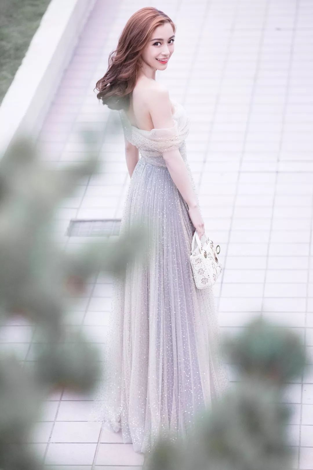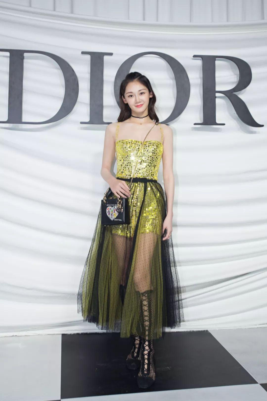 她身穿Christian Dior 2018早秋系列不对称单肩亮片刺绣纱裙,手拿白色Dior戴妃包。