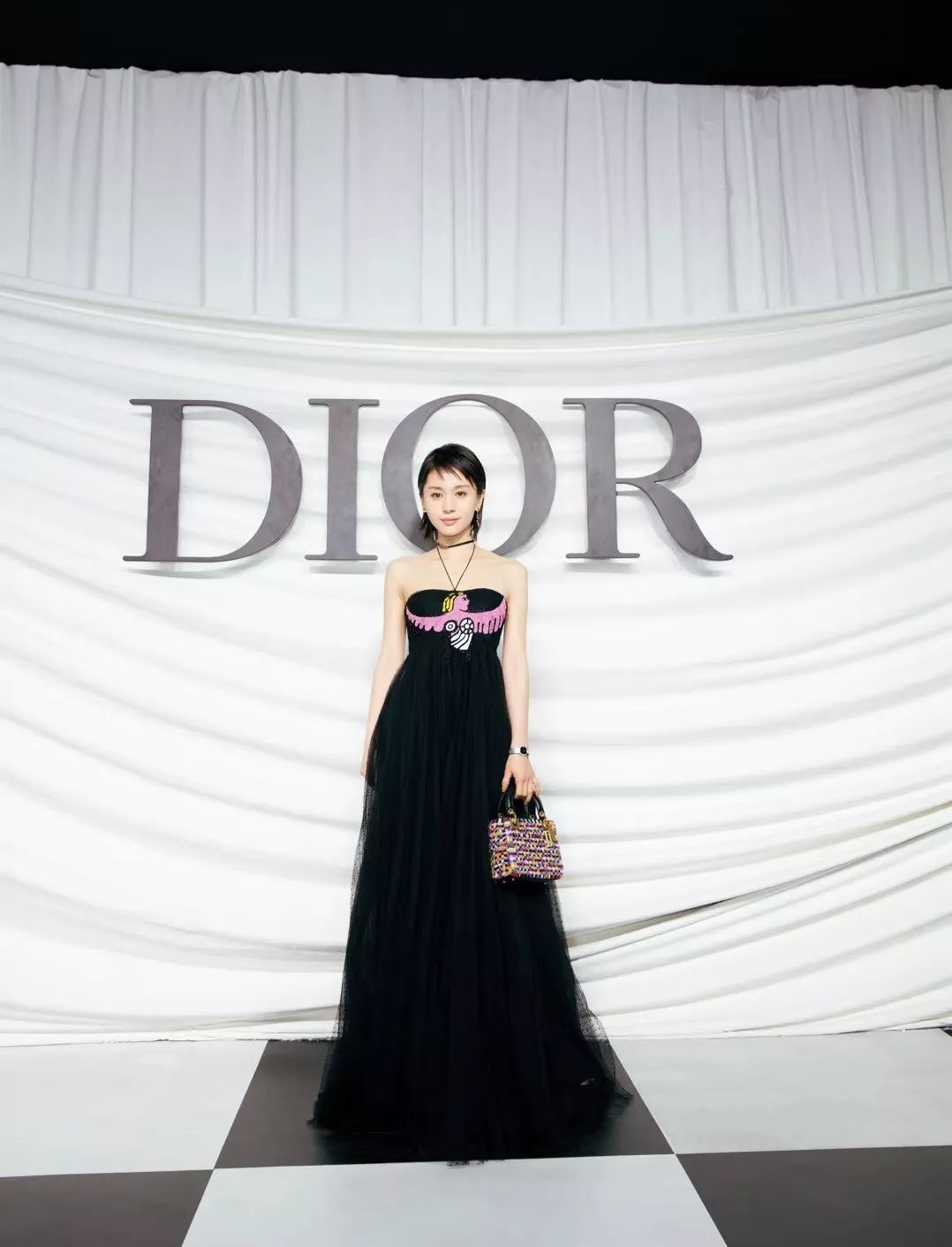 王子文戴镶钻choker项链,Dior卡通天使刺绣抹胸小黑裙,独特的灵气之美与品牌完美契合。