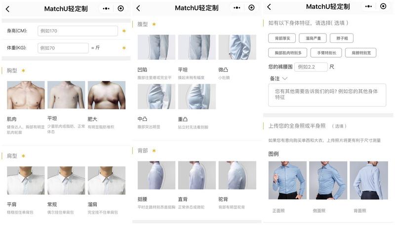 「MatchU」成立于2016年1月,目前的定位是一家基于微信小程序的线上男装个性化定制品牌,打出的口号是"两分钟完成在线定制,7天急速发货。”