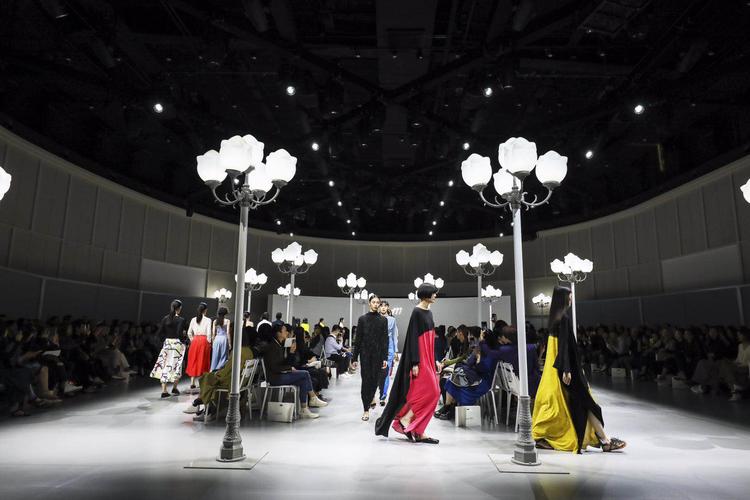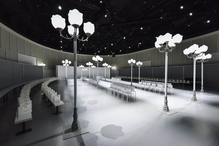 这个观点集中体现在秀场设计:观众的白色座椅将这个圆形场所分割为三条小路,路边点缀有 90 年代常见的白玉兰路灯——日常但也优美。