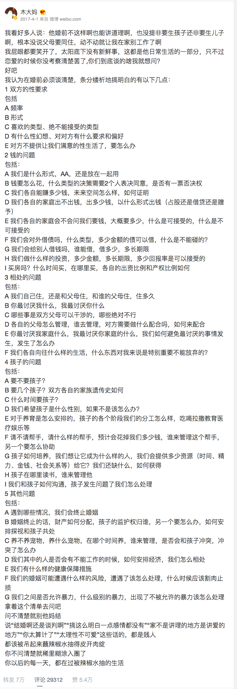 在 3800 多条微博中,最受争议的那条有 7 万多条转发。那条微博里,她建议大家要在婚前弄清十几个问题,这些问题涵盖了*生活性**、金钱关系、双方相处、育儿,还有在婚姻行将终止时的情形和对策,但却唯一没有提到——爱情。