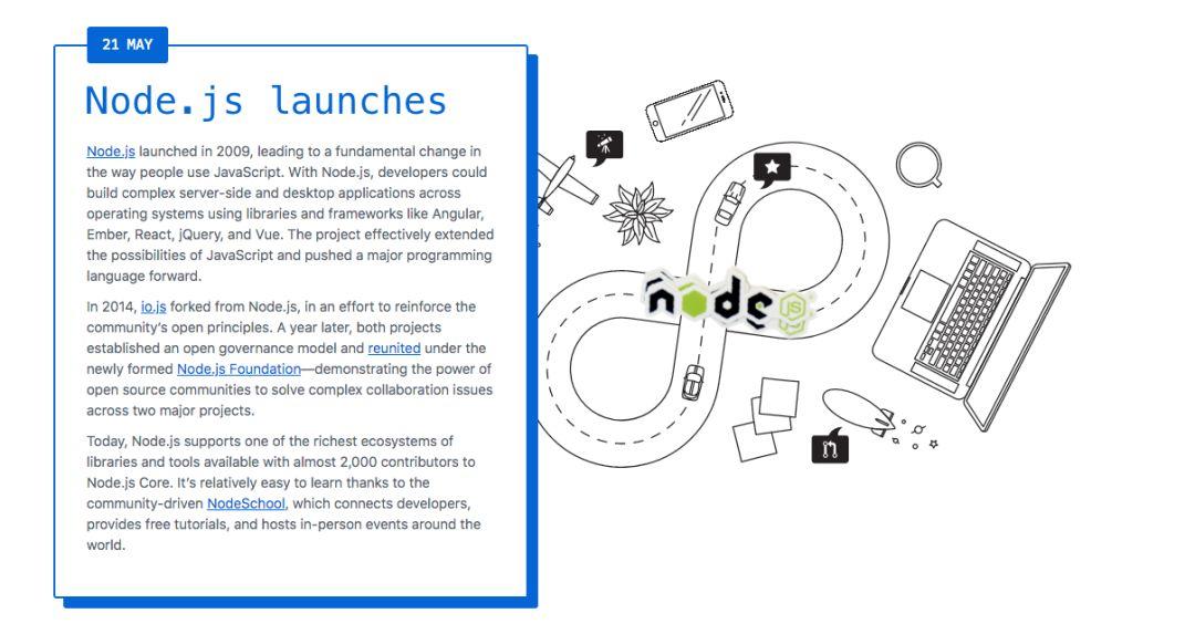 Node.js 的主要意义是让前端用 JS 即可完成前端需要的大量开发任务,开发适配多种操作系统的复杂服务器端应用。简单来说,它同时把前端和后端工程师从各自不熟悉的领域内解放了出来。2009 年 5 月底,Node.js 正式在 GitHub 上发布,收到了不少前端和后端人士的追捧,被认为是未来趋势。