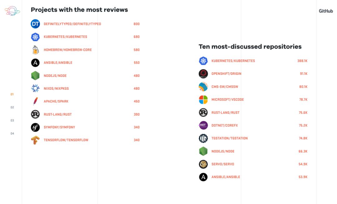 review 最多的项目,DefinitelyTyped、K8S、Homebrew;讨论最多的 repo,K8S、Origin、CMSSW
