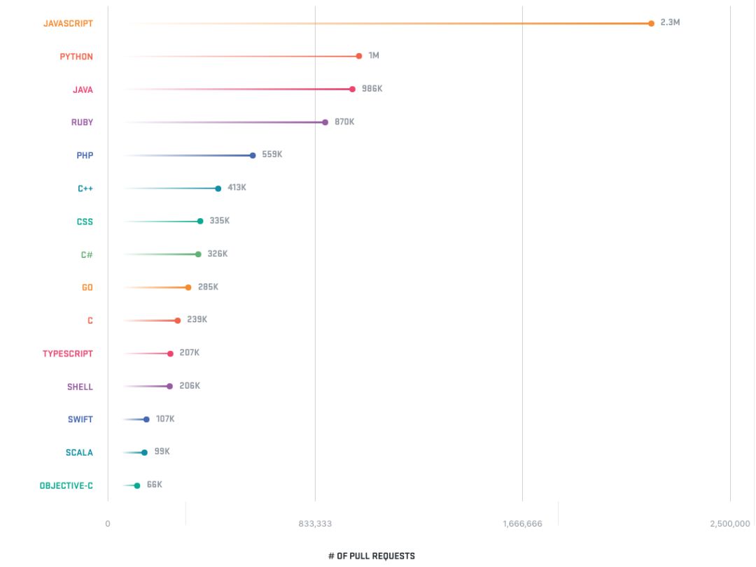 最后,给一些 GitHub 整理的资料。首先,按照 PR 统计的受欢迎语言,JS、Python、Java、Ruby、PHP: