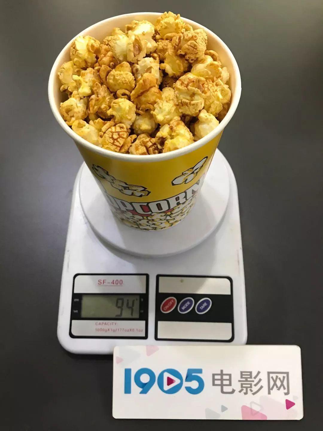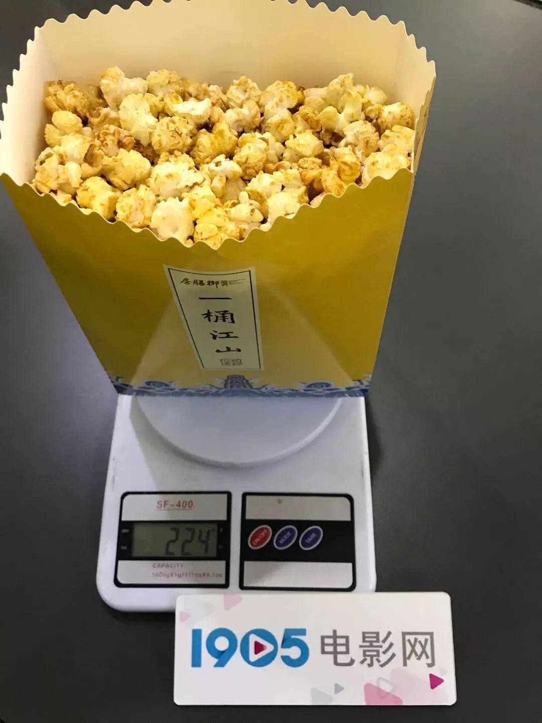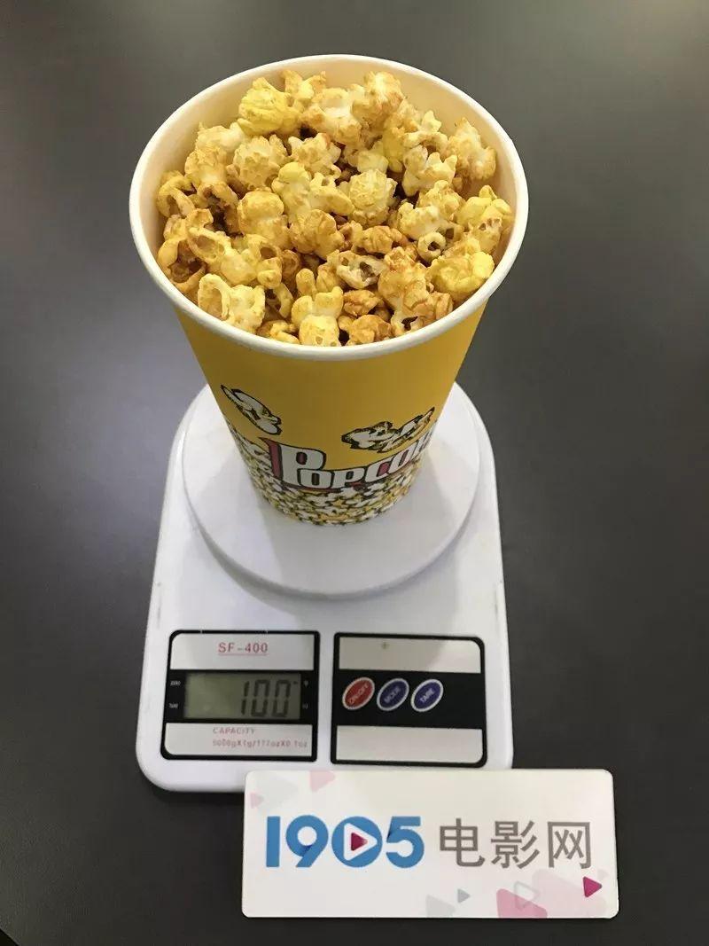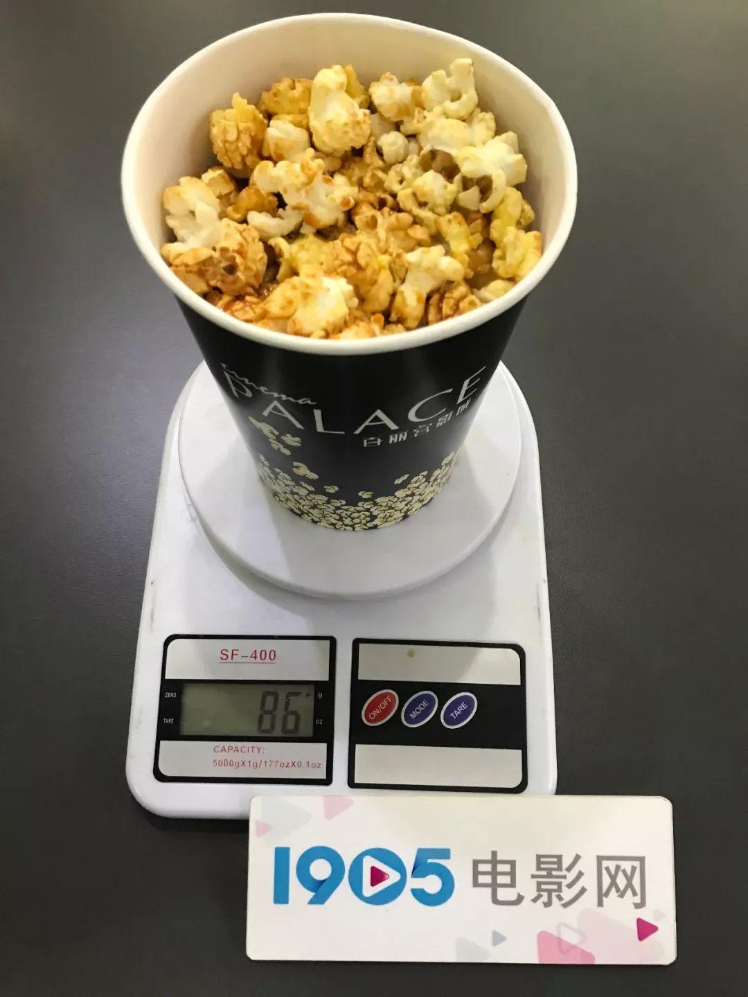 高峰期人流如织的金逸影城(朝阳大悦城店)在工作日的早晨相当冷清。23元一小桶的价格不算贵,但明显分量不足,离桶边还有不小的距离。称重后质量仅有90克。