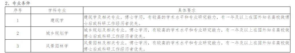 主要引进国内外建筑学、城乡规划学、风景园林学科重点高校毕业博士及以上高级人才,具有国外学习背景(一年以上,具有国外博士学位)者优先。具有突出学术科研成果的人才可以不受上述条件限制。