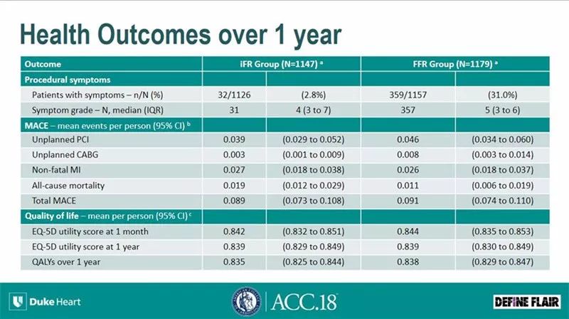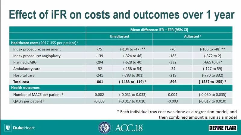 昨日,研究者在本次ACC会议上又发布了该研究的另一结果,进一步比较了iFR和FFR指导血运重建策略1年时的卫生经济学效应。首先对两组患者住院期间生成的所有费用包括手术相关和PCI治疗相关的费用进行收集汇总,随后又对1年随访过程的临床用药、特殊就诊和MACE事件处理等相关费用进行收集。同时对患者生活质量进行问卷调查,并以质量调整的生命年为指标,采用标准卫生经济学的相关统计分析。最终发现,iFR指导的血运重建在患者的生活质量和MACE事件发生情况不劣于FFR的情况下,可以带来更好的卫生经济学效应,减少医疗费用近九百美元。