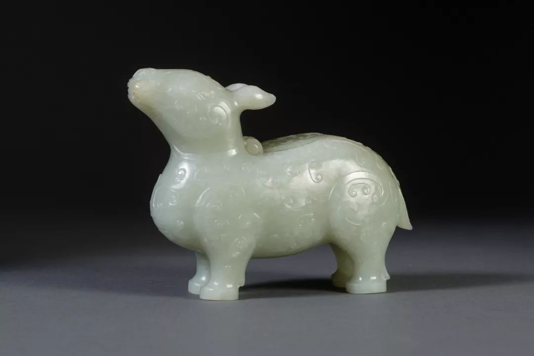 古代青铜牺尊背部承酒,身错金银纹饰,在祭祀仪式上盛酒温酒。到了明清,牺尊又成为一种吉祥的摆设,广泛陈设于书斋厅堂当中。这件玉牺尊用于文房,既可以盛水以研磨润笔,更是极为尊贵的摆设。在各种仿古器中,牺尊的工艺难度最大,不仅有外部的整体造型和纹饰工艺的装饰,还要掏空内膛,使其具有盛酒或盛水的功能。