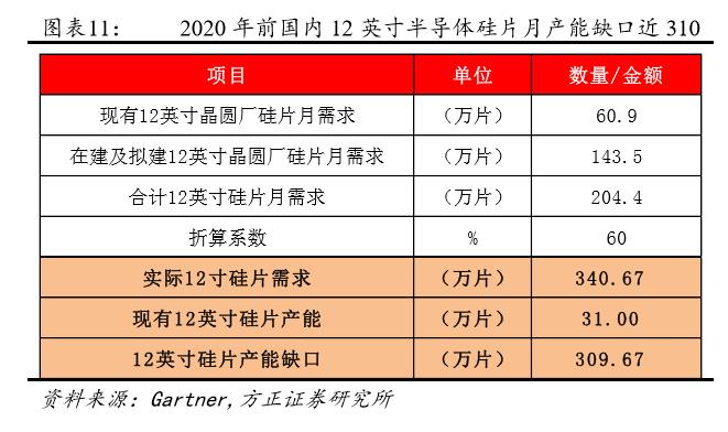 方正证券通过对国内已投产、在建以及拟建的晶圆厂产能系统梳理,得出2018到2020年,国内晶圆厂8英寸、12英寸硅片实际需求为每月173万片和341万片。