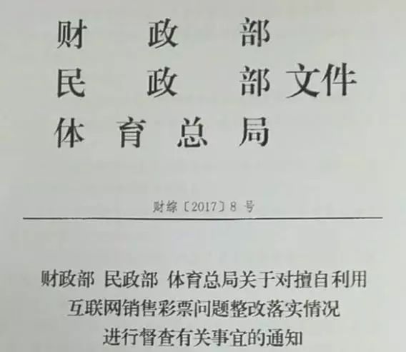 据《北京商报》报道,2017年2月,财政部、民政部、体育总局联合下发加急文件《关于对擅自利用互联网销售彩票问题整改落实情况进行督查有关事宜的通知》,再次查处整顿互联网彩票。