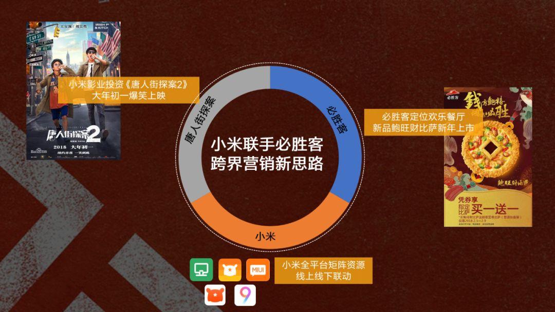 IP营销 | 小米必胜客与《唐人街探案2》在《唐人街探案2》放映前的路演宣传期,小米结合《唐人街探案2》的IP热度,为必胜客定制《唐人街探案2》“新春必胜家宴”,开设必胜客《唐人街探案2》主题店,同时动用小米的线上线下媒介资源为必胜客与《唐人街探案2》的这场合作造势。最终实现资源推广总曝光达1.55亿。