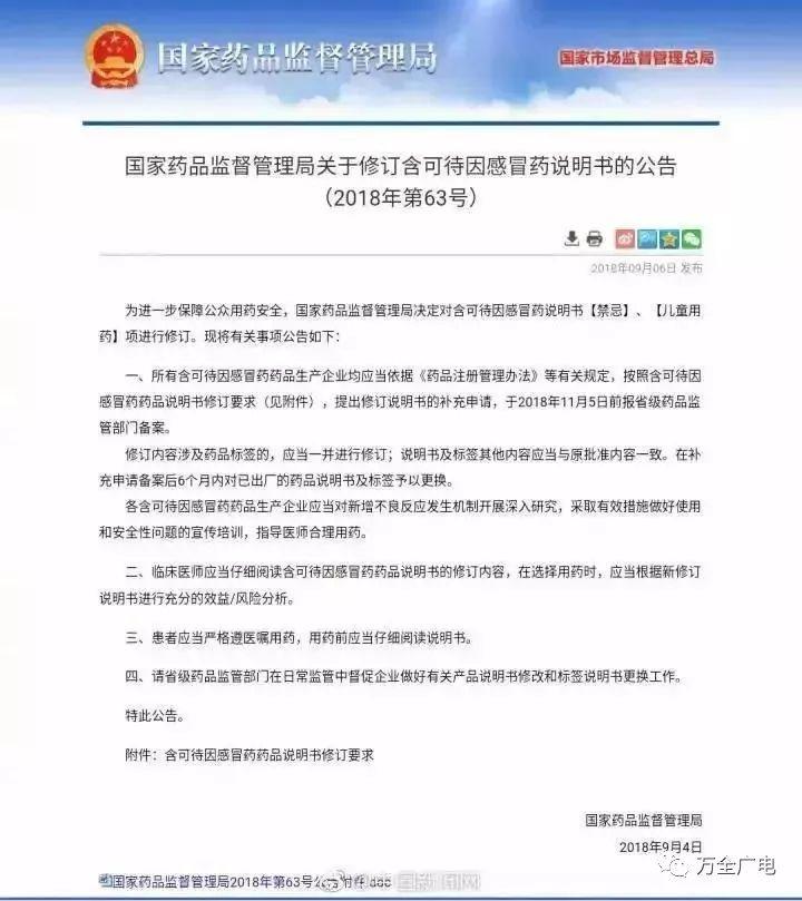 公告要求,对含可待因感冒药药品说明书进行修订:将“禁忌症”及“儿童用药”中相关内容均修订为“18岁以下青少年儿童禁用本品”。