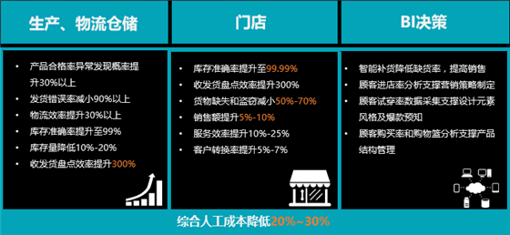 根据零售客户实践数据,运用RFID技术客户收益颇丰,在仓储环节,库存准确率提升至99%;库存量降低10%-20%;收发货、盘点效率提升300%以上。在供应链环节:发货错误率减少99%;物流效率提升30%以上;异常事件发现概率提升30%以上。在门店环节:货物缺失和盗窃减少50%-70%;门店销售额提升5%-20%;服务效率方面提升10%-25%。