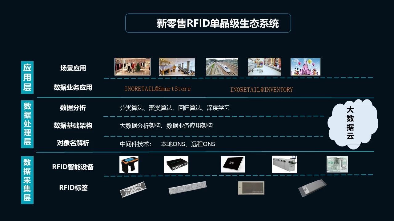 在智慧门店端,应用更加丰富。RFID技术可以采集用户行为数据(如试衣、触摸率等),同时RFID与视频结合,实现VIP客户管理以及远程巡店管理;RFID批量收银台,无需逐一扫码,实现收银零等待。另外,还可以实现线上下单,线下找货、取货,高效快捷;对周边门店库存以及线上线下库存进行实时调拨管理。