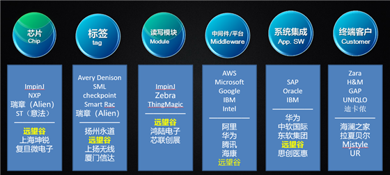 远望谷作为国内唯一一家涉及RFID全产业链的产品与解决方案供应商,在针对零售行业的端到端的价值链上,着力打造自己在大数据中台的采集与应用核心竞争力。在核心的芯片研发、设备研发、智能制造、智慧供应链解决方案、智慧门店解决方案等方面提供一站式的整体方案,成为支撑零售生态环境的技术服务商之一,支撑零售大数据采集和应用的平台服务商。