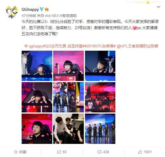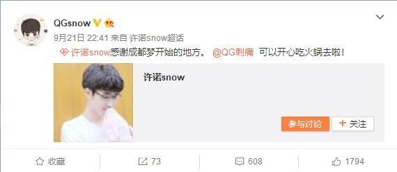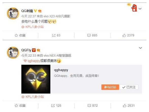 在队员们的赛后微博中,刺痛率先提出了去吃什么的问题,飞牛则表示客场成都很是美味啦~看来是已经想好了要吃什么了嘛!