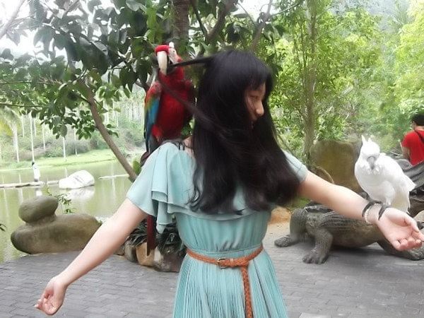 这就是女汉子!看到没有!鹦鹉和蛇都是十块钱一个人,给你拍照用的,时间不限。