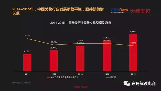 根据第一财经商业数据中心(CBNData)联合天猫发布的 《2016中国美妆消费趋势报告》,2015年中国美妆产品零售交易规模达到4846亿,保持了约20%的年增长率,成为拉动快速消费品行业增长的核心品类。据东哥了解的数据,仅仅天猫平台2017年的交易额就超过了千亿规模。