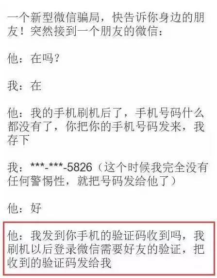 【提醒】如果你的朋友问你要手机号码并没有问题,但要了手机号接着又找借口问你要手机验证码就很有问题!如果有人向你索取短信验证码,千万别给,这可能是要*取盗**你的微信号,进而*取盗**你与手机绑定银行卡的钱或者向你的微信好友行骗。