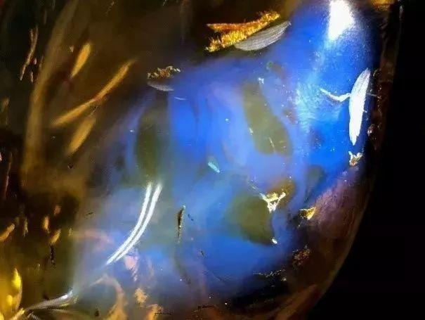 蓝珀是指透视观察其体色为黄、棕黄、黄绿和黄褐等色,黑色背景自然光下呈现通体浑厚的蓝色,紫外光下蓝色更明显的琥珀。