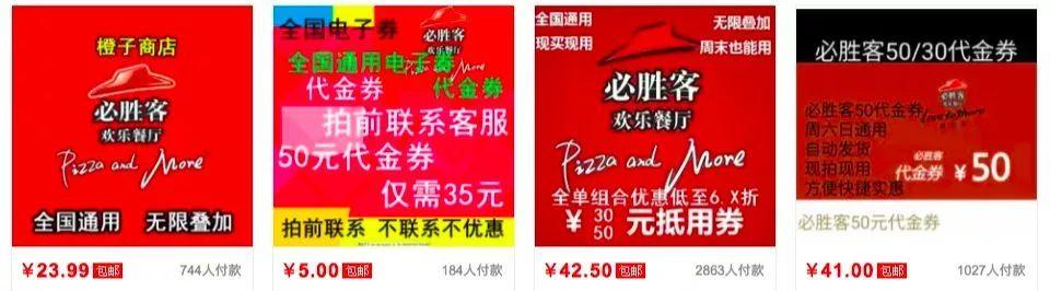 必胜客30和50元代金券:淘宝上有必胜客代金券卖,30元的代金券24元,50元的代金券35-42元不等,35元可能就需要你帮店家多拍不同店的商品。你下单成功后,店家会给你一串条码,你给必胜客他们服务员刷一下就可以了,这个代金券没有时间限制,可以和其他优惠叠加,代金券本身也可以叠加使用。