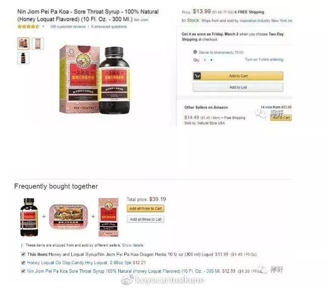 就算购买套餐也不是不能接受,完全在美国的物价可接受范围之内。例如这一款39.19美元的套餐包含300毫升枇杷膏/不同包装各一瓶,含片有三盒,不少了。