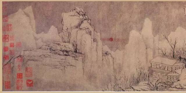 8.董源小山石。谓之矾头。山中有云气。此皆金陵山景。皴法要渗软。下有沙地。用淡墨扫。屈曲为之。再用淡墨破。